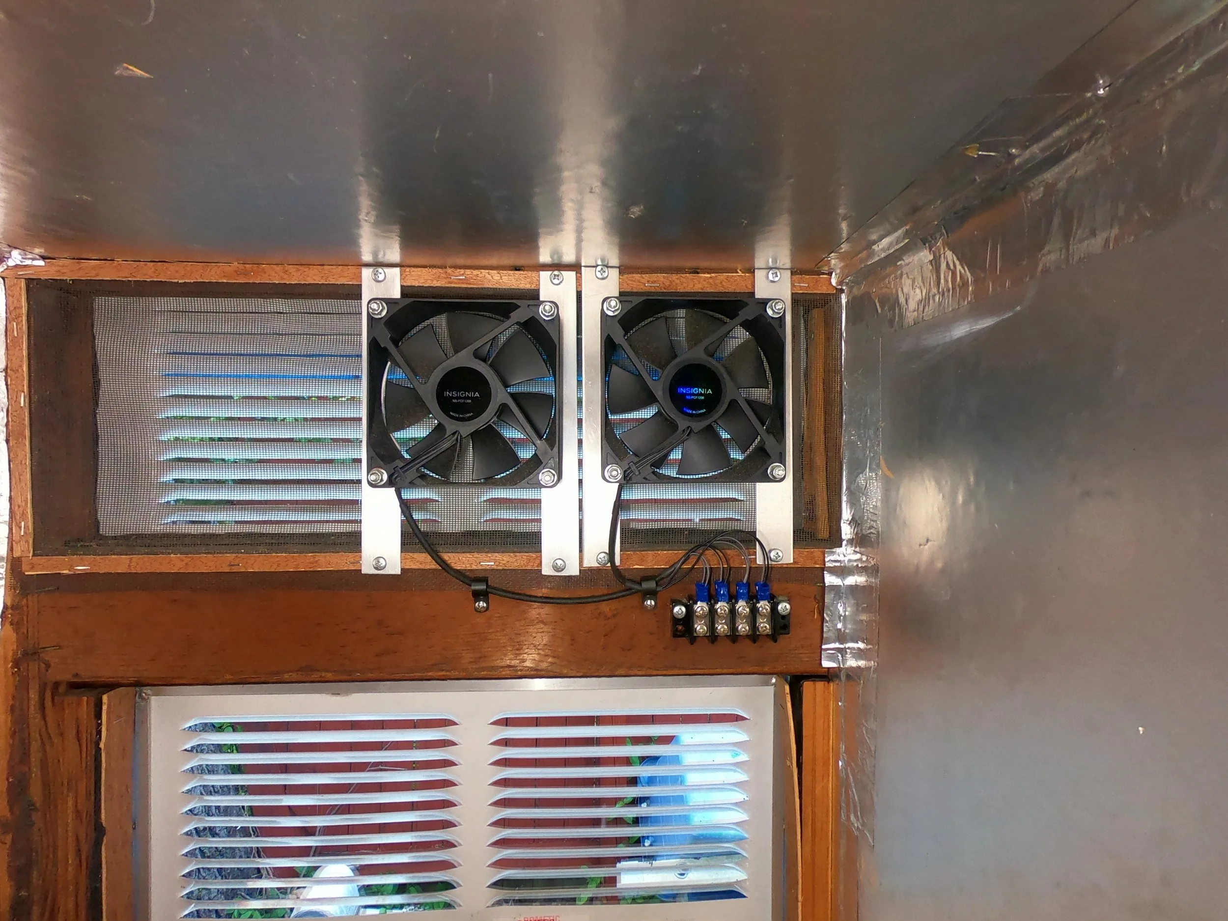 I added a sheet metal diffuser to force air flow up into the coils of the fridge and put 2 fans at the top of the space to push the hot air out.